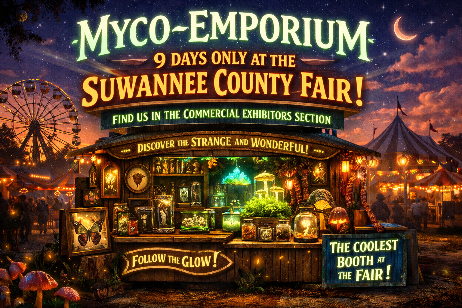 Suwannee County Fair 1302 11th St SW, Live Oak, FL, United States🌾🍄✨ MYCO-EMPORIUM IS COMING TO THE 2026 SUWANNEE COUNTY FAIR ✨🍄🌾 For 9 DAYS ONLY, Myco-Emporium will be calling the Suwannee County Fair home.You’ll find us inside the Commercial Exhibitors Section — just follow the glow. We’re bringing a fully curated experience of natural history and bio-science wonders: handcrafted biorelics, living cultures, educational displays, and […]
