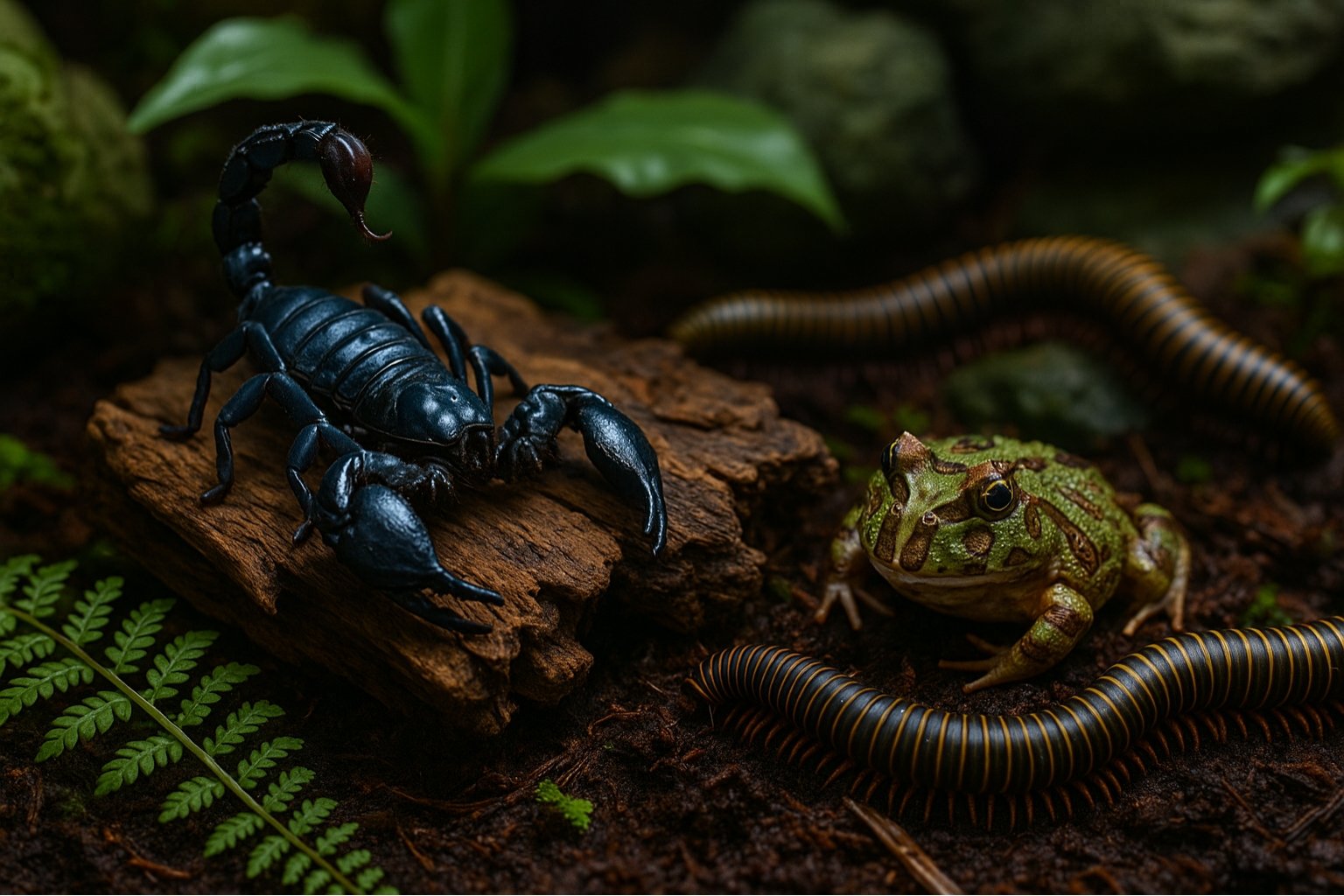- Décor: Cork tubes, branches, bromeliads/epiphyte-style mounts, hardy vines.