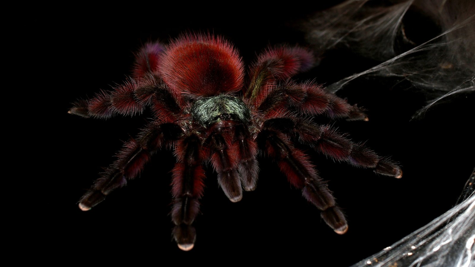 - Striking contrast: dark carapace with pink toe pads and iridescent sheen.